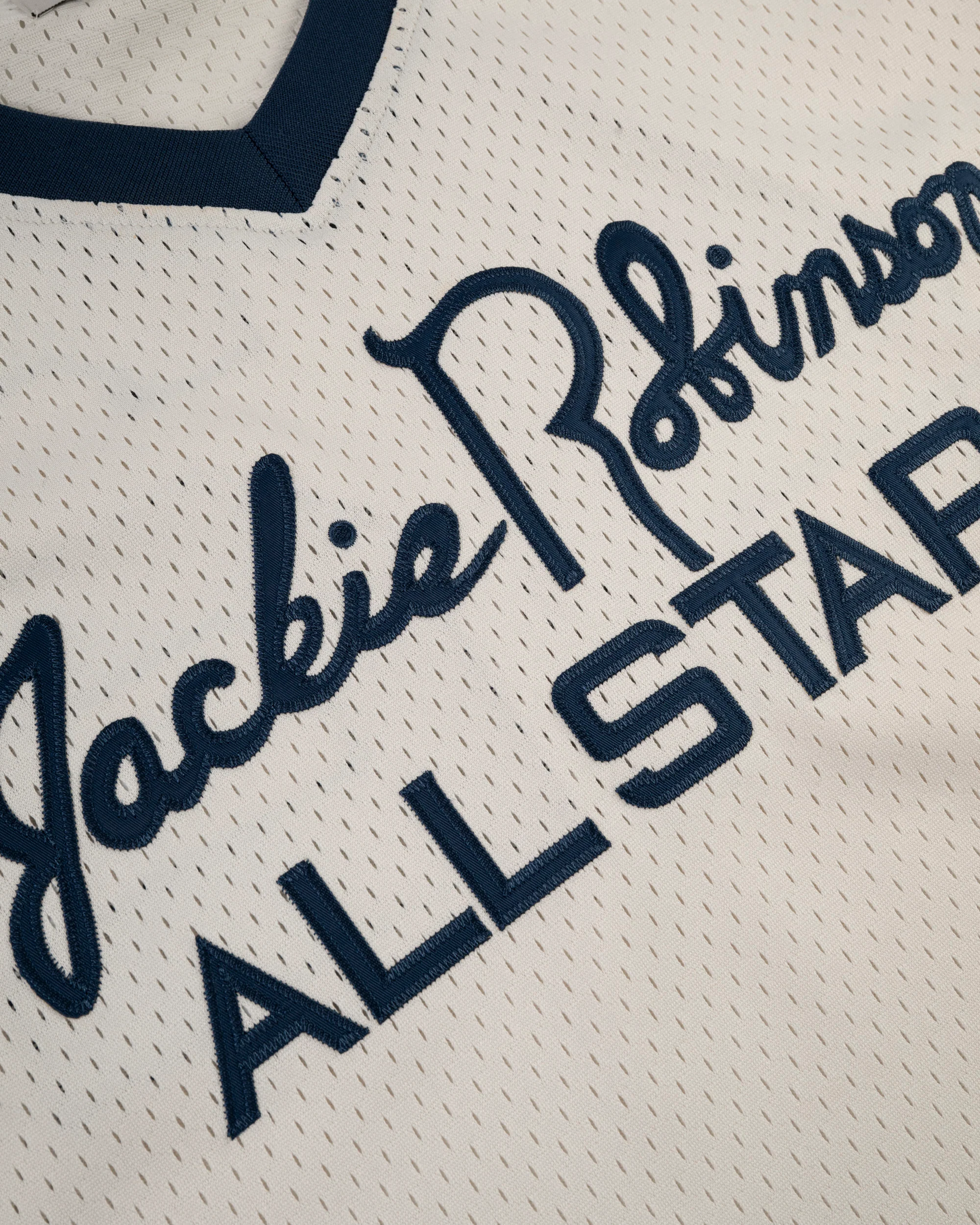 We made this throwback mesh V-neck jersey to celebrate Jackie’s All-Stars and their impact on the game. Made with logos and lettering inspired by the designs of Jackie’s era, this mesh jersey is lightweight, breathable, and easy to wear, perfect for repping baseball history without working up a sweat.
