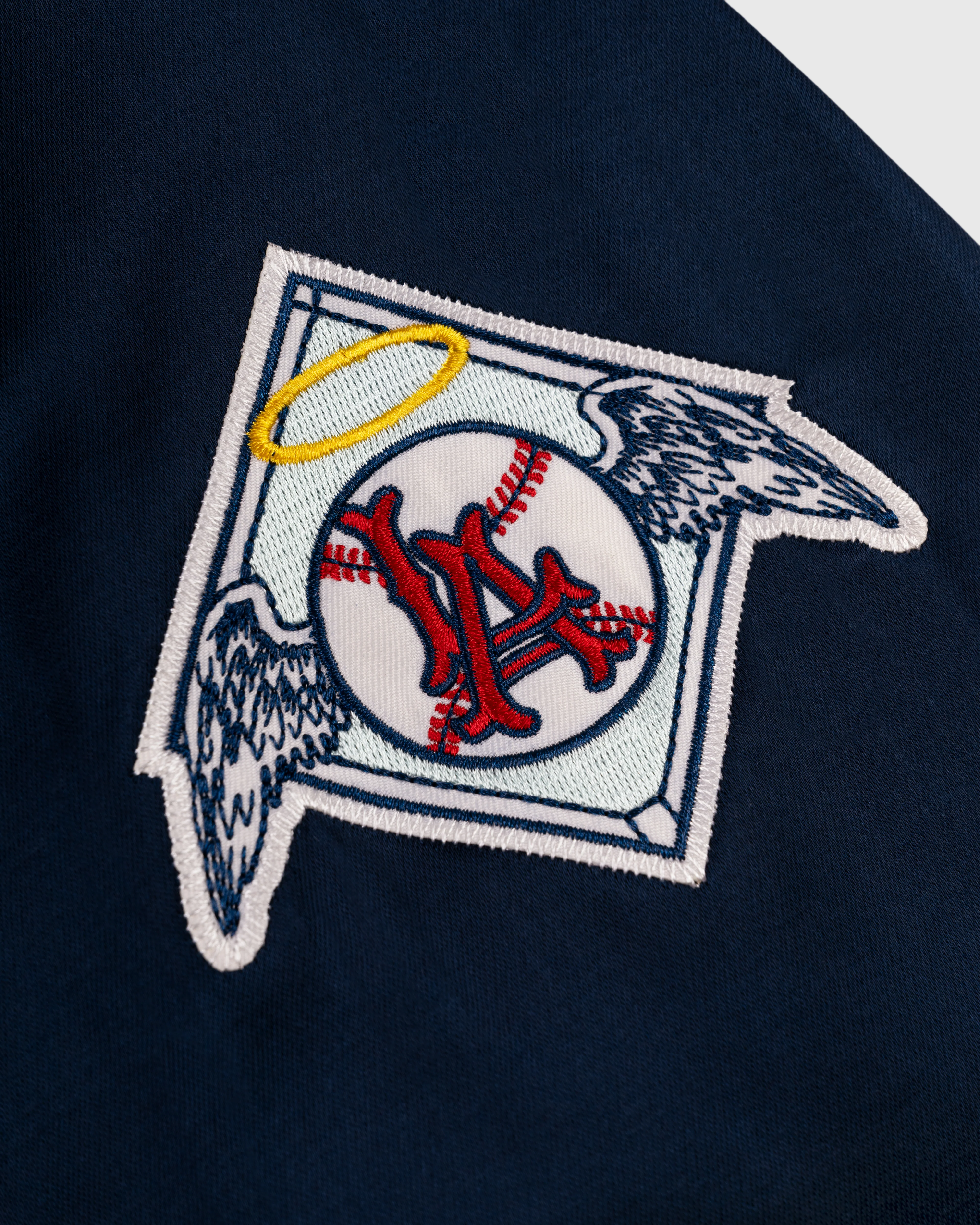 We pay them homage by recreating their on-field windbreaker, made with a navy blue acetate/cotton-satin blend and finished with heavy-duty snaps, slash pockets, and a red-on-white twill “LA” patch on the chest.